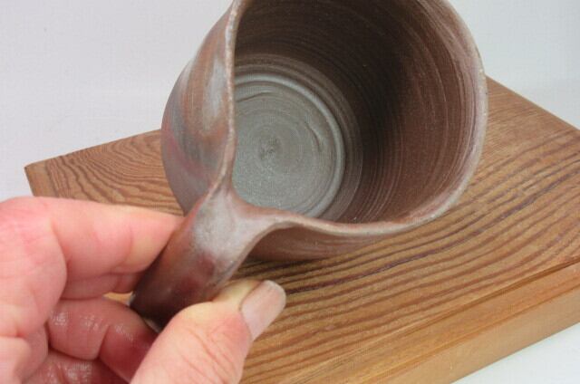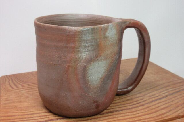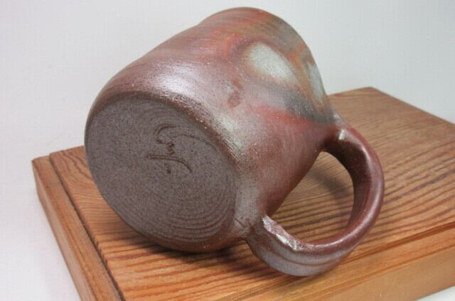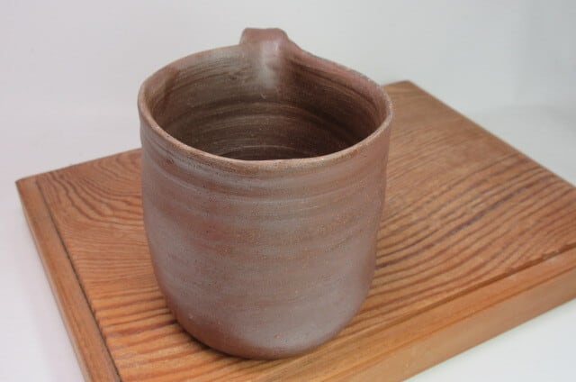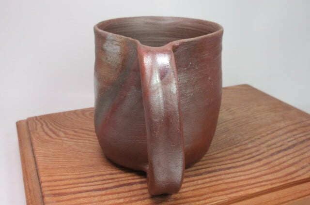 このカップは、玄明の手作りです。工房と窯のある山から切り出した薪で焼き上げています。備前焼は、窯の中で薪の炎で完成させます。他の産地の焼き物の場合、薪を熱源として使う場合には汚れないように焼くことがほとんどですが、備前焼は逆です。